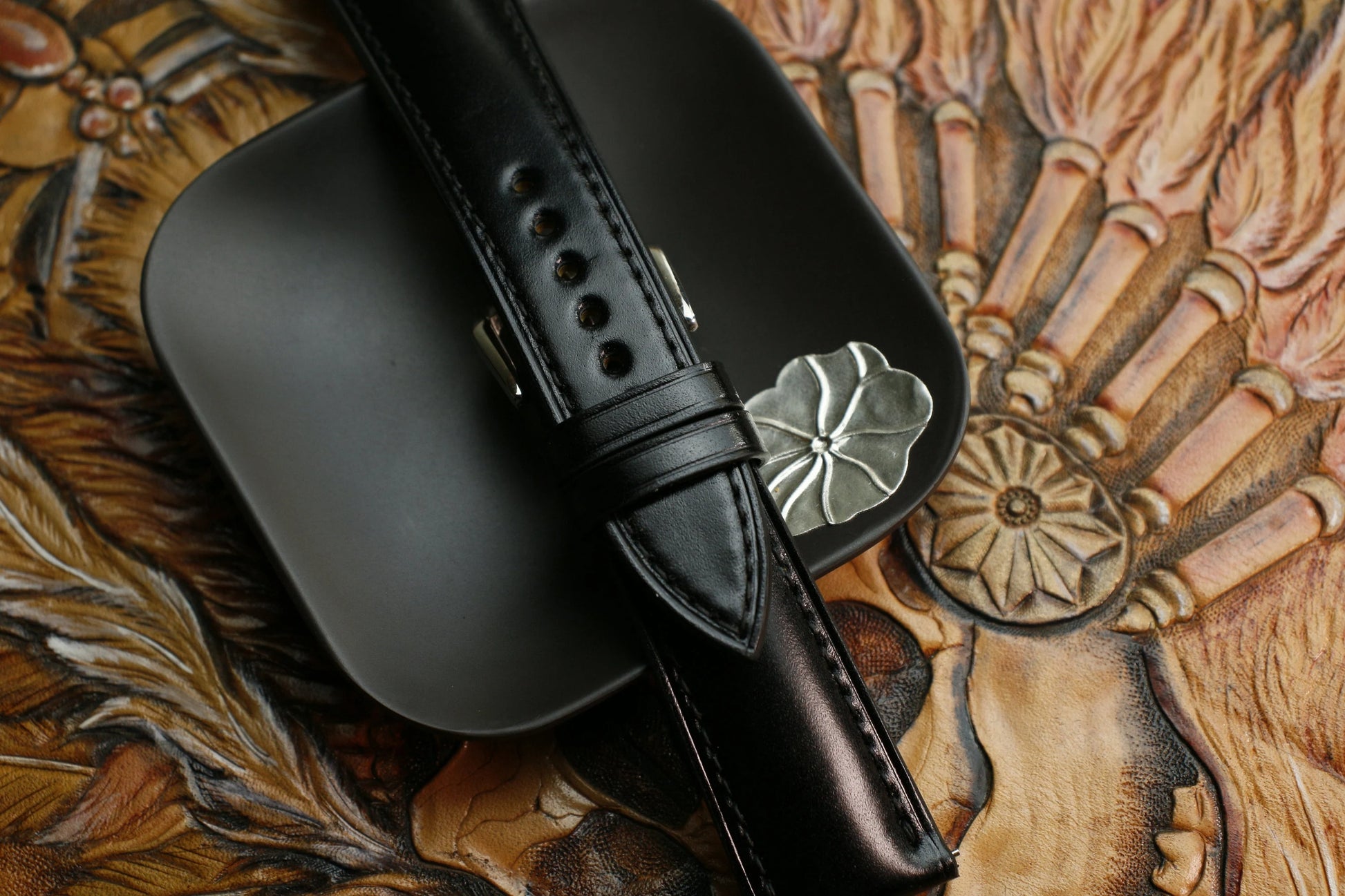 Each mens watch band is hand-cut from premium Shinki Shell Cordovan shells, ensuring optimal grain and color consistency. The strap is hand-stitched with precision, edges are hand-finished to a mirror polish, and the leather is treated to enhance its natural water resistance. The decorative silver concho adds a distinctive touch of artisan character.
