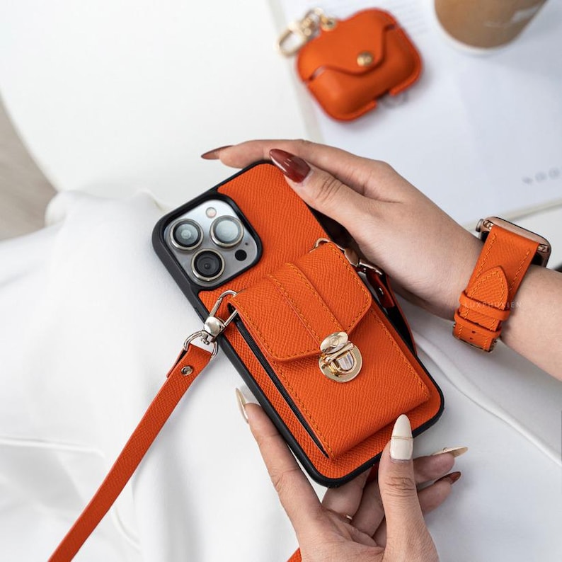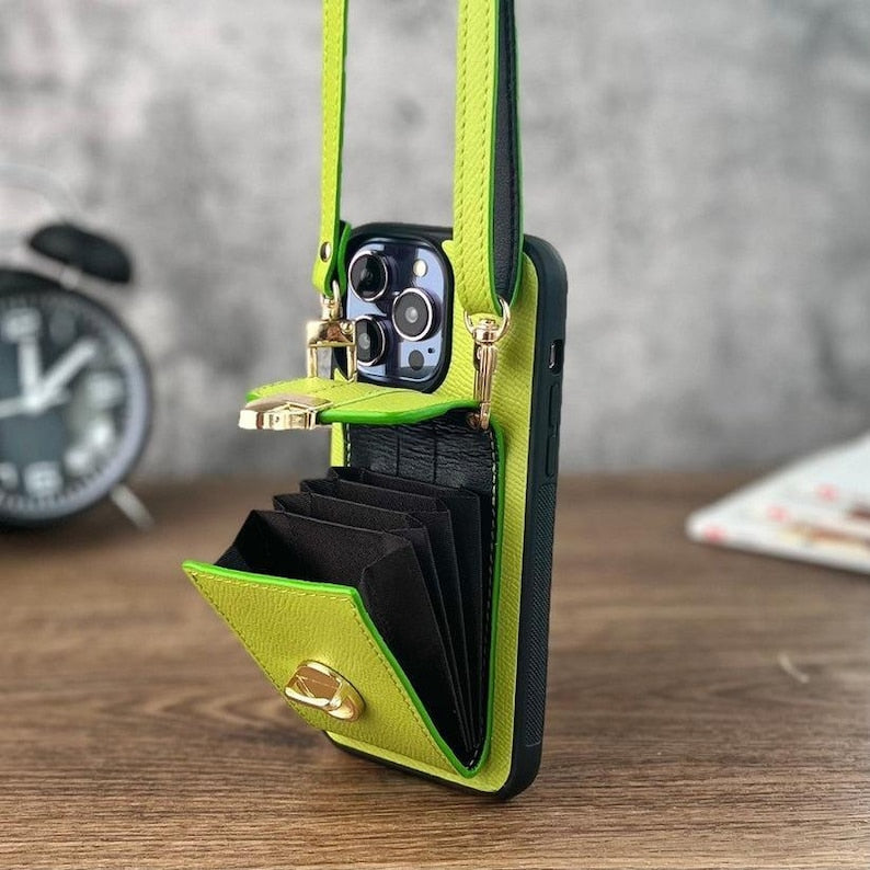Each case is handcrafted using traditional leatherworking techniques. The Epsom leather is carefully cut, edges are hand-finished and painted, and the card slots are precisely constructed for optimal functionality. The gold-tone hardware is securely attached, and the detachable strap features premium leather and metal components.
